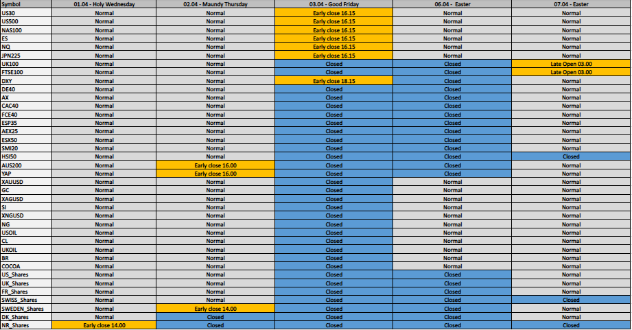 On the 3rd and 6th of April, the Good Friday and Easter will be celebrated. Trading hours will be affected on certain instruments due to closure of certain banks, exchanges, and prime brokers. The trading schedule is as follows: