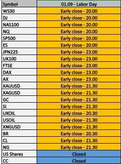 On the 1st of September, the Labor Day Holiday will be celebrated in the United States and Canada. Trading hours will be affected on certain instruments due to closure of certain banks, exchanges, and prime brokers. The trading schedule is as follows: