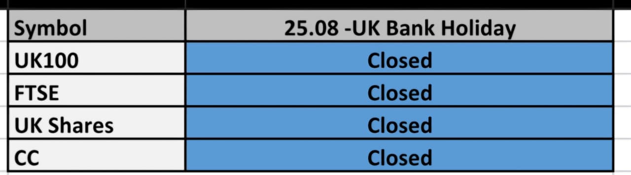 On 25th of August, the UK Bank Holiday will be celebrated in the UK. Trading hours will be affected on certain instruments due to closure of certain banks, exchanges, and prime brokers. The trading schedule is as follows: