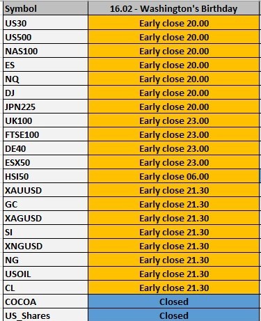 On the 16th of February, Washington’s Birthday Holiday will be celebrated. Trading hours will be affected on certain instruments due to closure of certain banks, exchanges, and prime brokers. The trading schedule is as follows:
